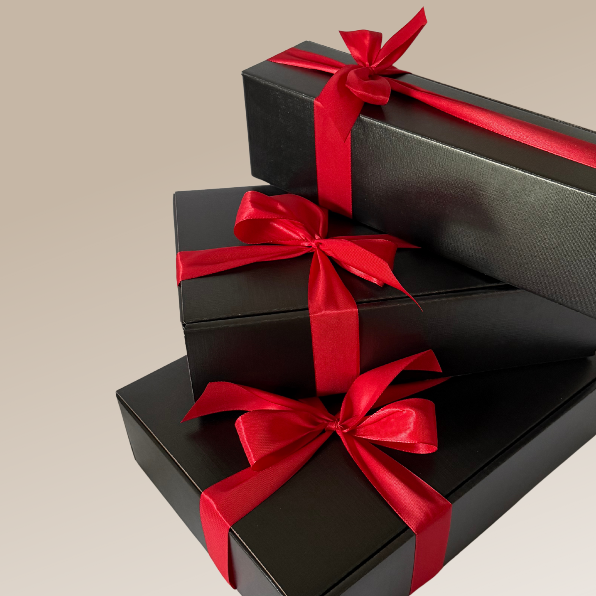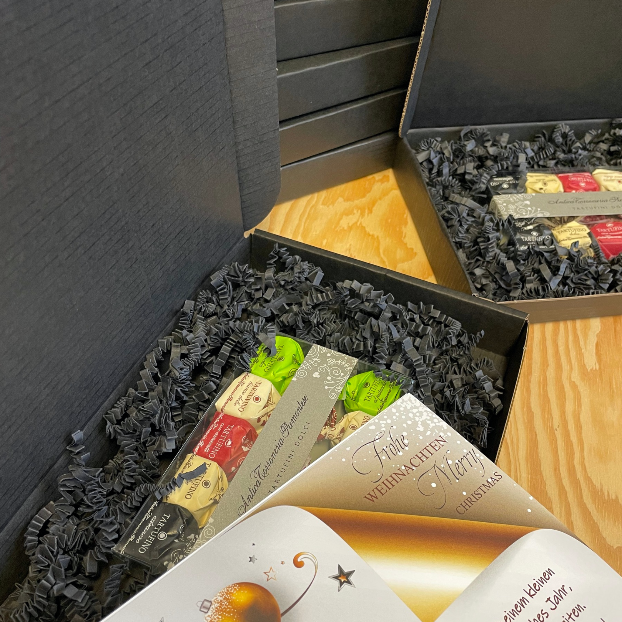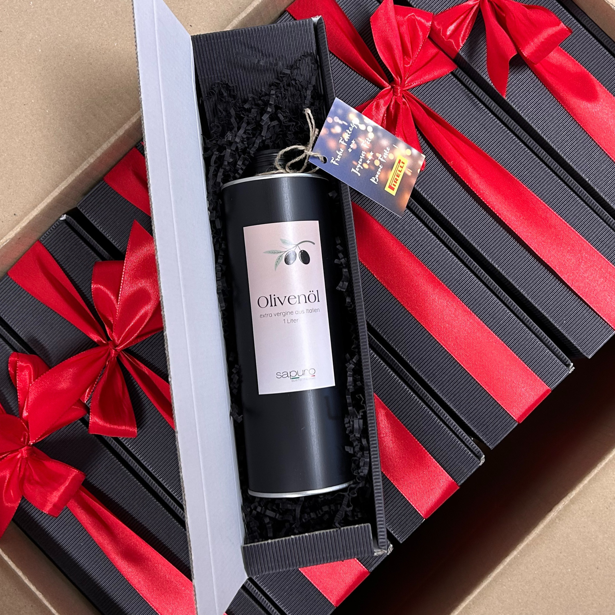 Unsere schwarzen Geschenkboxen sind ab CHF 59.90/Stk. erhältlich. Wir veredeln sie mit einer Schleife, passend zu den Farben deiner Firma, und verleihen dem Geschenk damit die besondere italienische Eleganz.