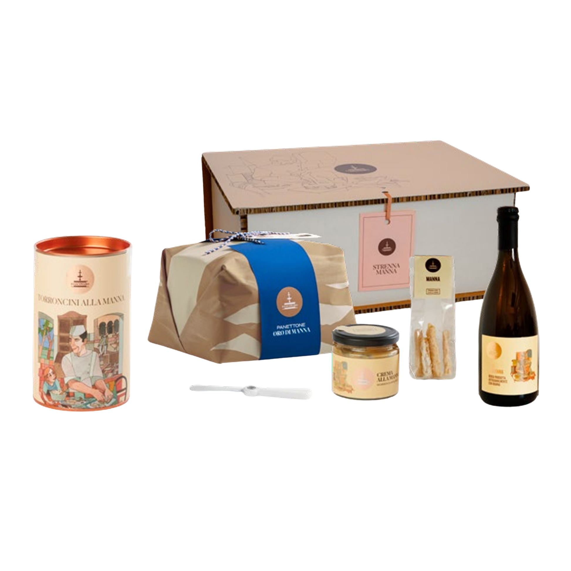 Die Strenna Manna von Fiasconaro ist eine luxuriöse Geschenkbox, die die Einzigartigkeit Siziliens feiert. Herzstück ist der Panettone Oro di Manna (1 kg) – eine Rarität aus den Madonien, verfeinert mit Gianduia-Schokolade, weisser Schokolade und der kostbaren Manna-Creme.